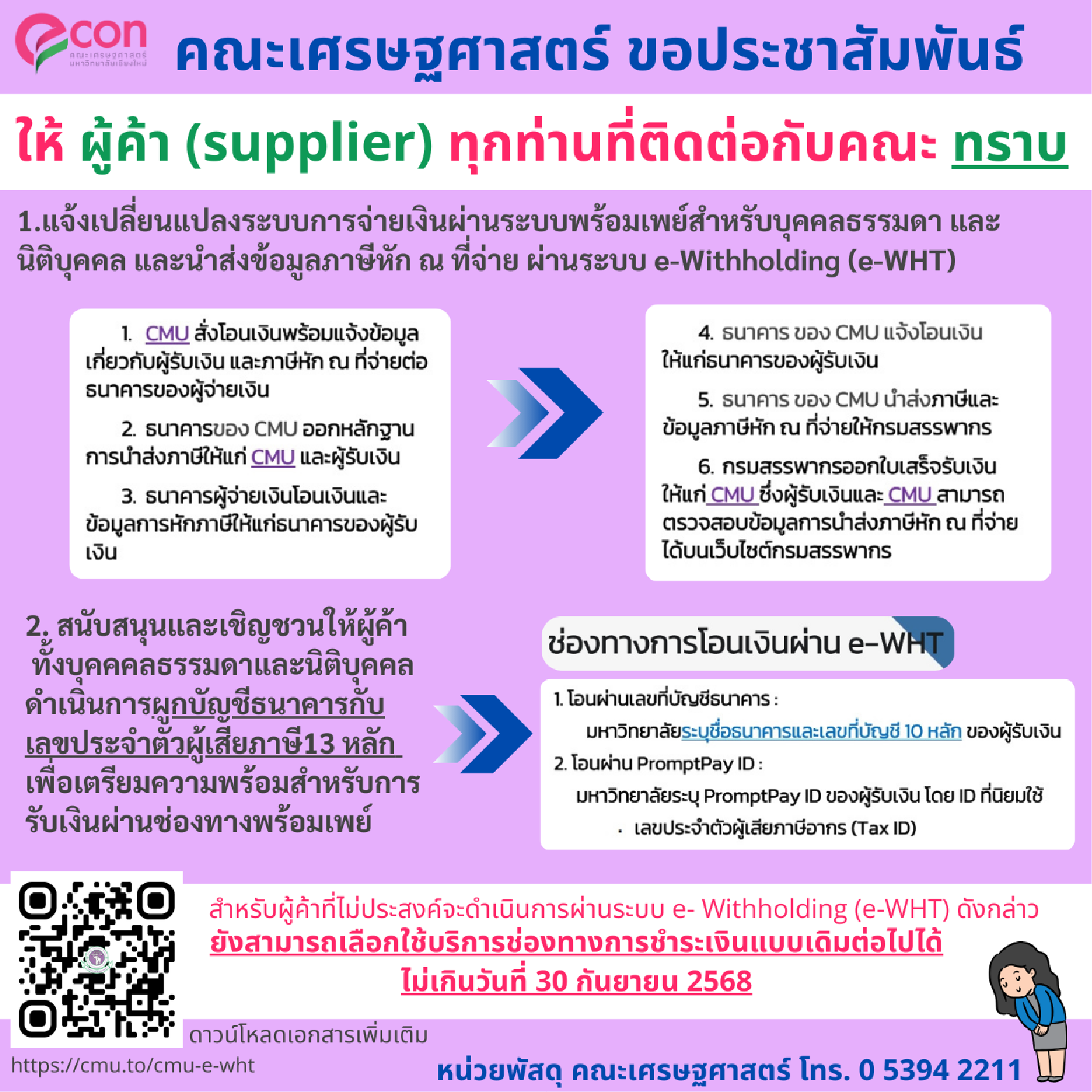 สำหรับการจ่ายเงินให้แก่ผู้ค้า (Supplier) ซึ่งระบบดังกล่าวจะดำเนินการจ่ายเงินผ่านระบบพร้อมเพย์สำหรับบุคคลธรรมดา และนิติบุคคล (ผูกบัญชีเงินฝากธนาคารกับเลขประจำตัวผู้เสียภาษี 13 หลัก) และนำส่งข้อมูลภาษีหัก ณ ที่จ่ายผ่านระบบ e-Withholding Tax โดยอัตโนมัติ ซึ่งจะช่วยให้การจ่ายเงินมีความรวดเร็วและมีประสิทธิภาพยิ่งขึ้น เพื่อให้การเปลี่ยนผ่านระบบการจ่ายเงินเป็นไปด้วยความเรียบร้อย และผู้ค้า (Supplier) สามารถรับเงินได้อย่างรวดเร็ว คณะเศรษฐศาสตร์จึงขอแจ้งให้ท่านทราบ ดังนี้