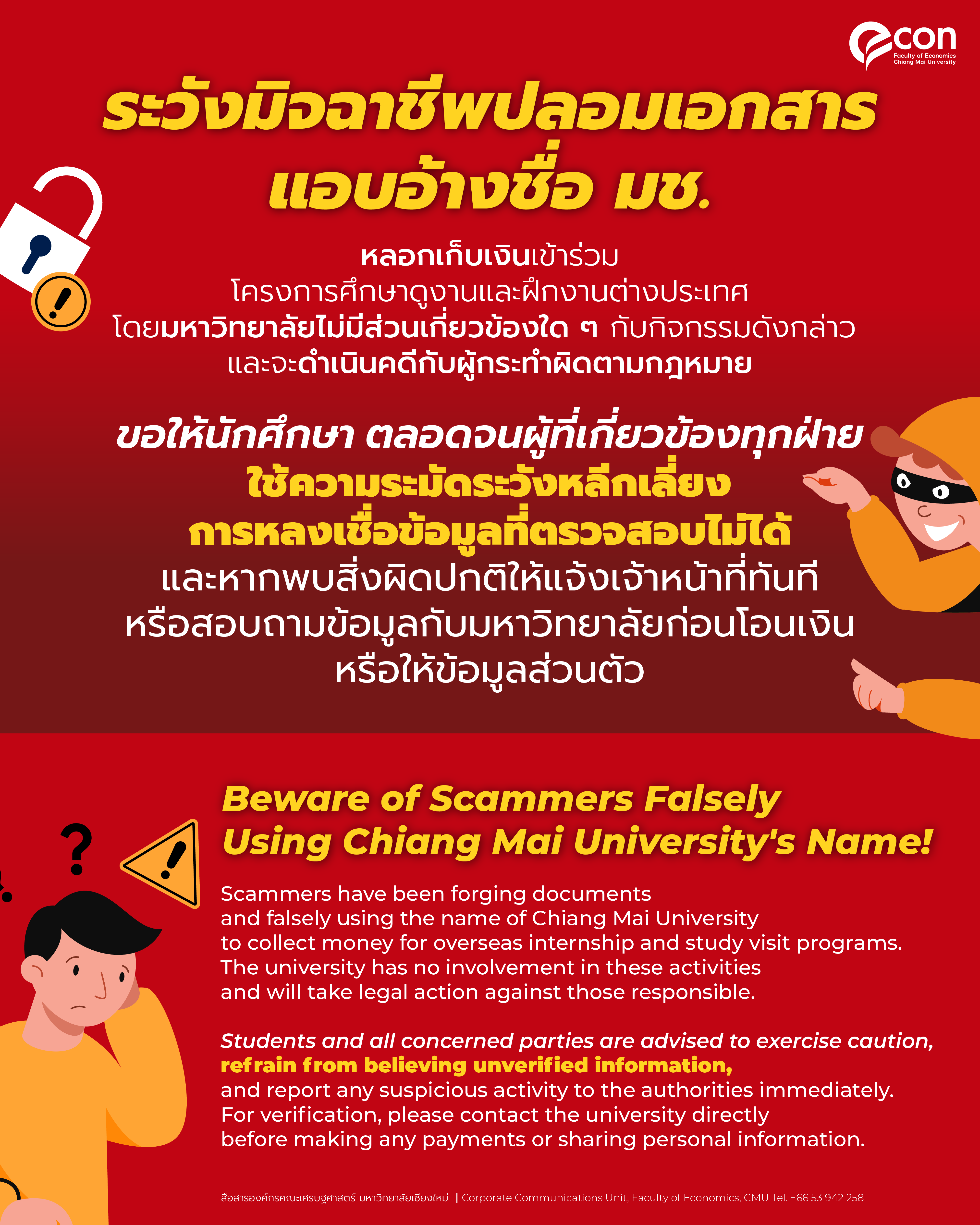❗ ระวังมิจฉาชีพปลอมเอกสาร แอบอ้างชื่อมหาวิทยาลัยเชียงใหม่ หลอกเก็บเงินเข้าร่วมโครงการศึกษาดูงานและฝึกงานต่างประเทศ โดยมหาวิทยาลัยไม่มีส่วนเกี่ยวข้องใด ๆ กับกิจกรรมดังกล่าว และจะดำเนินคดีกับผู้กระทำผิดตามกฎหมาย
