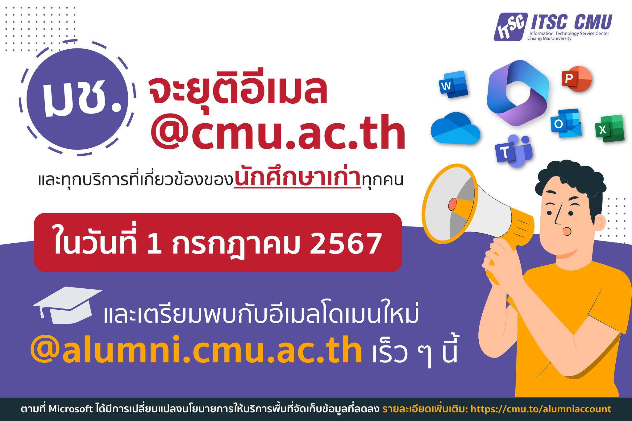“ทุกบริการภายใต้ Microsoft 365” และบริการอื่นๆ ที่ใช้ @cmu.ac.th ของนักศึกษาเก่าจะไม่สามารถเข้าถึงได้อีก เช่น