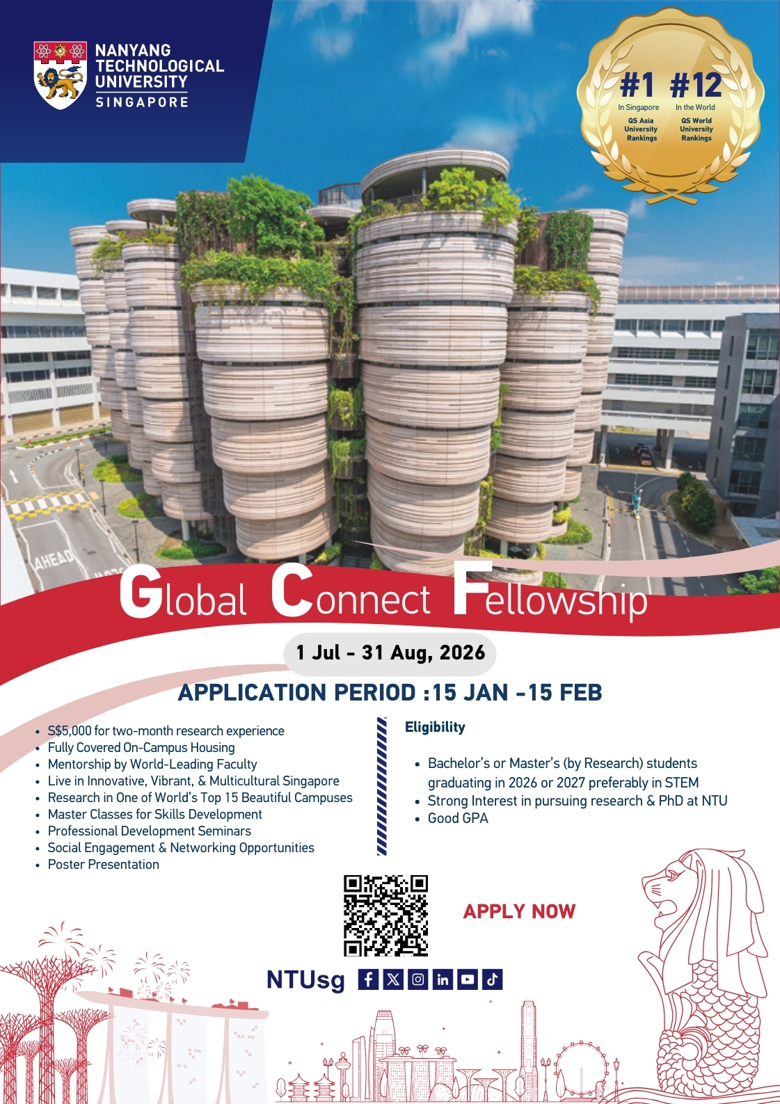 ด้วย Nanyang Technological University (NTU) ประเทศสิงคโปร์ เปิดรับสมัครนักศึกษาเข้าร่วมโครงการ Global Connect Fellowship (GCF) เพื่อเข้าร่วมทำวิจัยเชิงประสบการณ์ภายใต้การดูและคำปรึกษาจากคณาจารย์และนักวิจัยของ NTU เป็นระยะเวลา 2 เดือน ระหว่างวันที่ ระหว่างวันที่ 1 กรกฎาคม – 31 สิงหาคม 2569 ผู้ได้รับคัดเลือกเข้าร่วมโครงการจะได้รับ ทุนสนับสนุนการทำวิจัย จำนวน 5,000 ดอลลาร์-สิงคโปร์ และค่าที่พักระหว่างเข้าร่วมโครงการ ผู้สนใจสามารถดูรายละเอียดเพิ่มเติมได้ที่ https://www.ntu.edu.sg/about-us/global/global-connect-fellowship